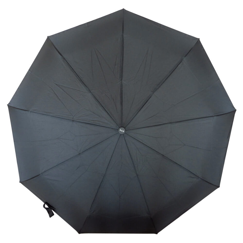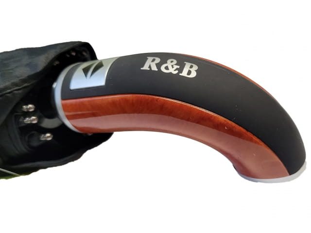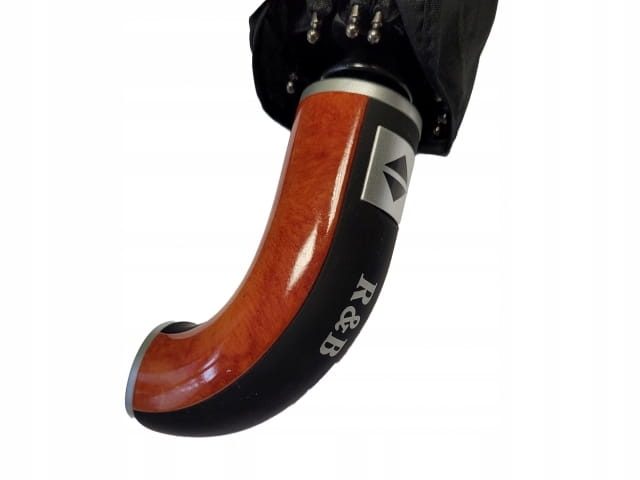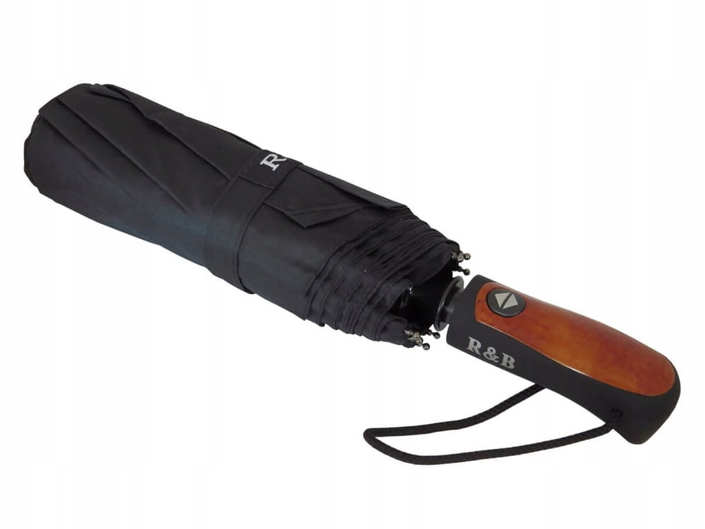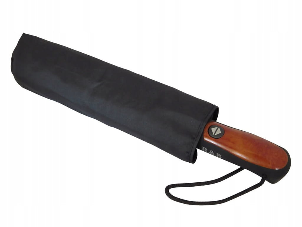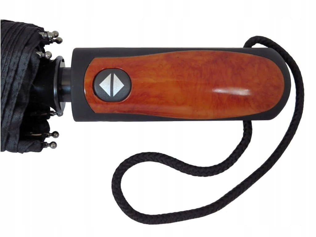 Automatyczny, duży, składany parasol męski w kolorze czarnym, z pokrowcem. Parasol jest otwierany i zamykany za pomocą jednego przycisku. Posiada elegancką, gumowaną rączkę z elementami imitującymi drewno, która nadaje mu ponadczasowości i klasy.