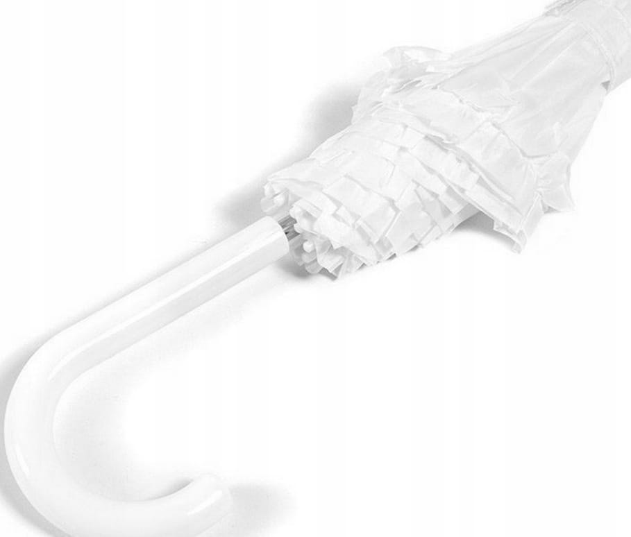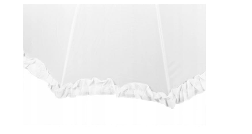 Składany, biały parasol z falbanką skutecznie ochroni Cię przed deszczem. Idealna odmiana dla klasycznych parasolek - nasza jest zupełnie transparentna - widzisz deszcz, ale z pewnością go nie poczujesz! :) Wyposażony w aż 8 ramion - co gwarantuje ochronę przed deszczem nawet przy silnym i porywistym wietrze! Produkt jest więc całkowicie odporny na niekorzystne warunki atmosferyczne.